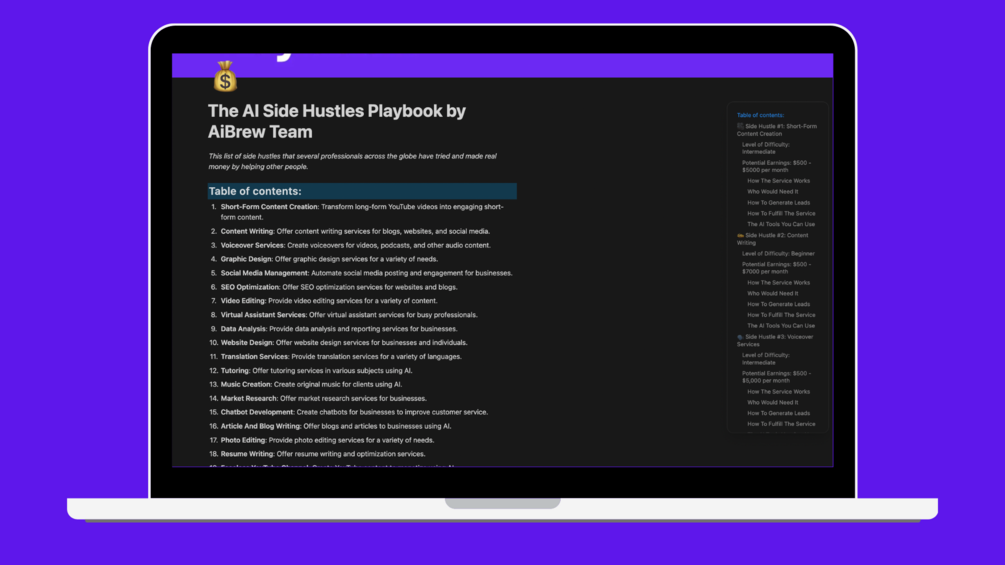 This playbook is packed with everything you need to start and succeed in your AI side hustle journey:
